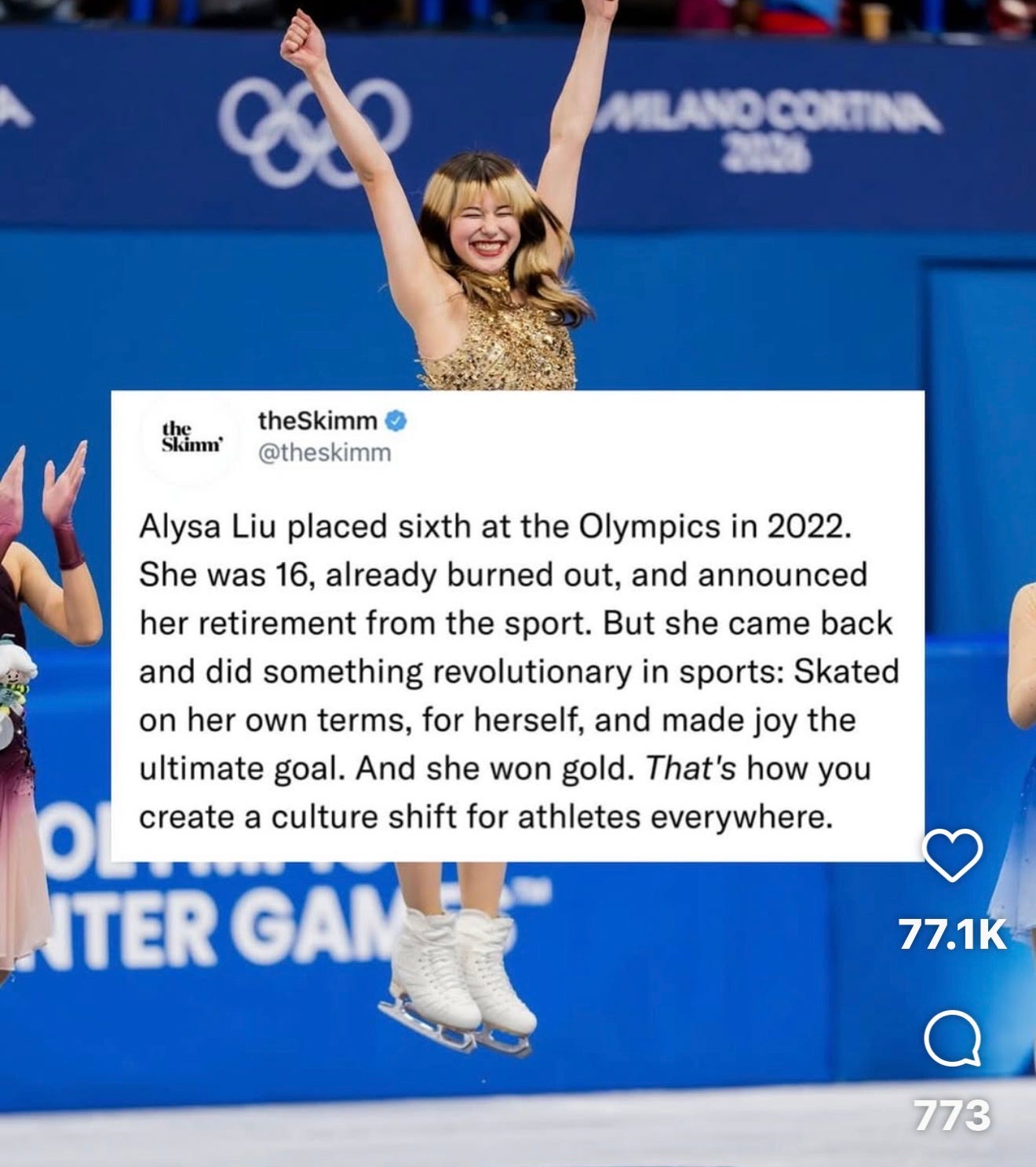 I will watch her long program from the 2026 Olympics once a week for the next year. I will watch the freedom in her body. I will watch the ownership. I will try to chip away at the walls I have built around myself over decades. No one else’s fault. Mine.